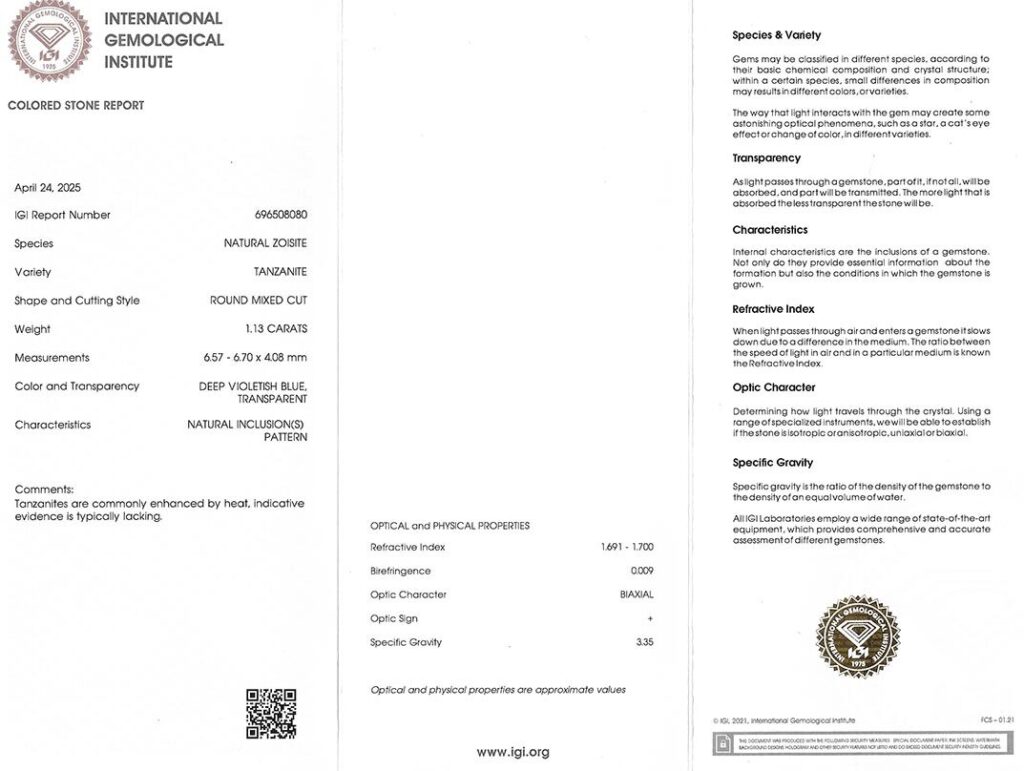 Kámen je včetně mezinárodně uznávaného certifikátu IGI a je zataven do ochranného pouzdra. Tanzanity jsou běžně tepelně vylepšovány; indikativní důkaz o úpravě obvykle chybí.