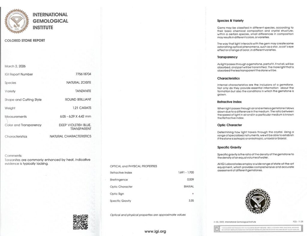 Kámen je včetně mezinárodně uznávaného certifikátu IGI a je zataven do ochranného pouzdra. Tanzanity jsou běžně tepelně vylepšovány; indikativní důkaz o úpravě obvykle chybí.