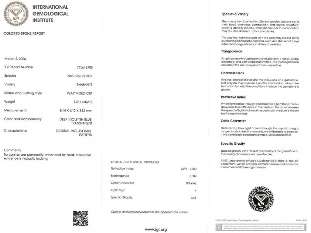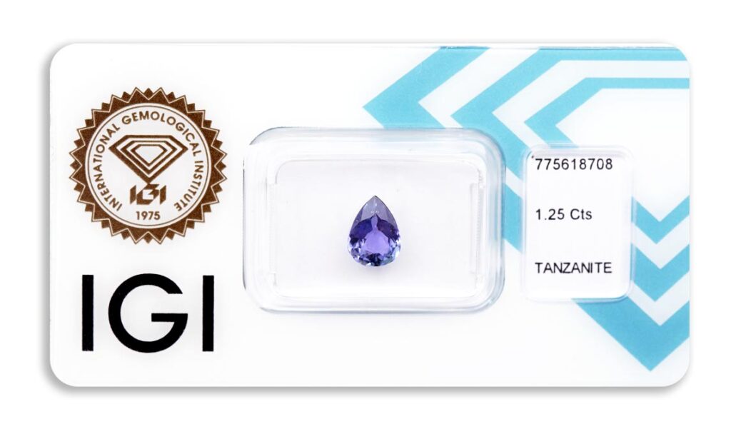 Kámen je včetně mezinárodně uznávaného certifikátu IGI a je zataven do ochranného pouzdra. Tanzanity jsou běžně tepelně vylepšovány; indikativní důkaz o úpravě obvykle chybí.