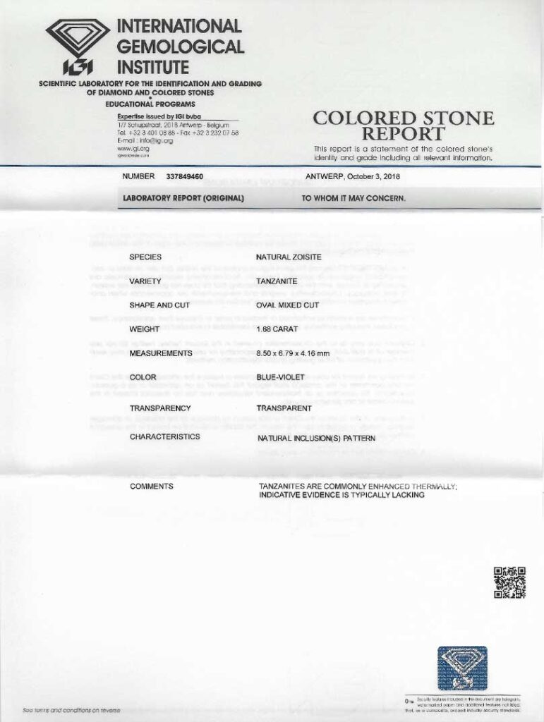 Kámen je včetně mezinárodně uznávaného certifikátu IGI a je zataven do ochranného pouzdra. Tanzanit byl tepelně upraven (jedná se o běžnou úpravu).