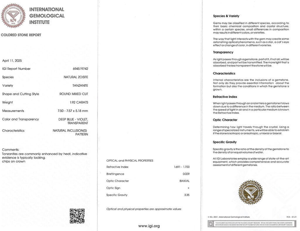 tanzanit 1.92ct deep blue - violet s IGI certifikátem
