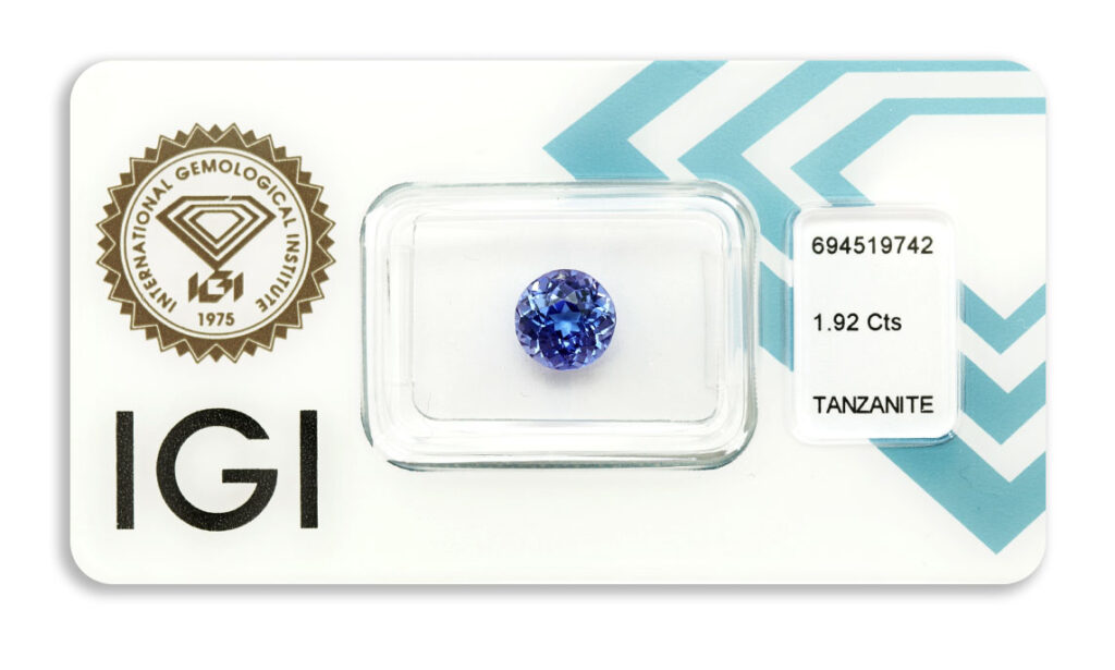 Kámen je včetně mezinárodně uznávaného certifikátu IGI a je zataven do ochranného pouzdra. Tanzanity jsou běžně tepelně vylepšovány; indikativní důkaz o úpravě obvykle chybí.