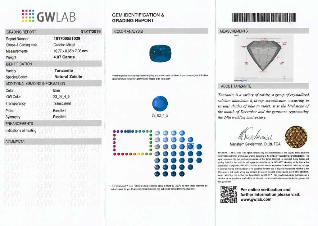 Kámen je včetně mezinárodně uznávaného certifikátu GWLAB. Tanzanit byl tepelně upraven (jedná se o běžnou úpravu).