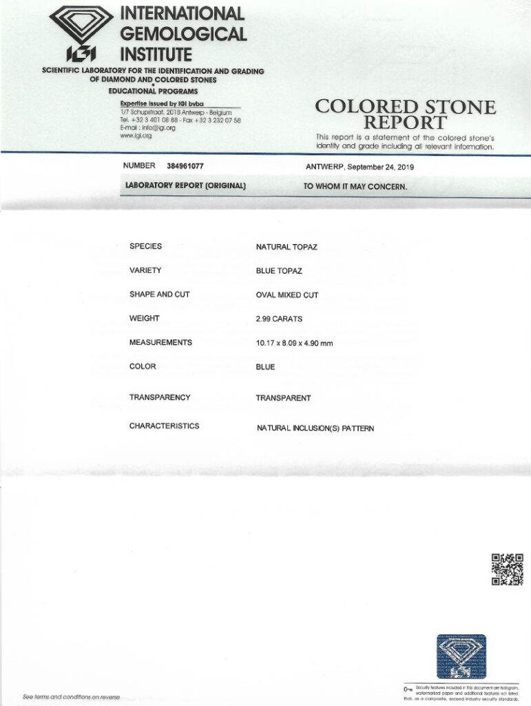 Kámen je včetně mezinárodně uznávaného certifikátu IGI a je zataven do ochranného pouzdra.