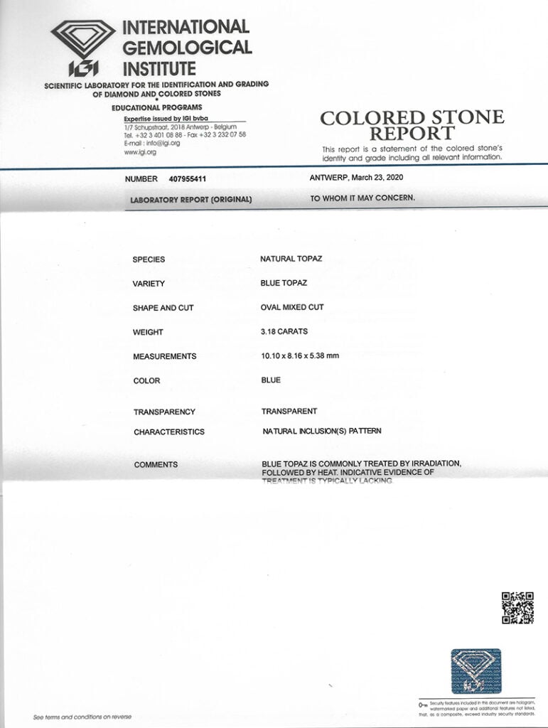 Kámen je včetně mezinárodně uznávaného certifikátu IGI a je zataven do ochranného pouzdra. Modré topazy jsou běžně upravovány ozařováním a tepelně vylepšovány; indikativní důkaz o úpravě obvykle chybí.