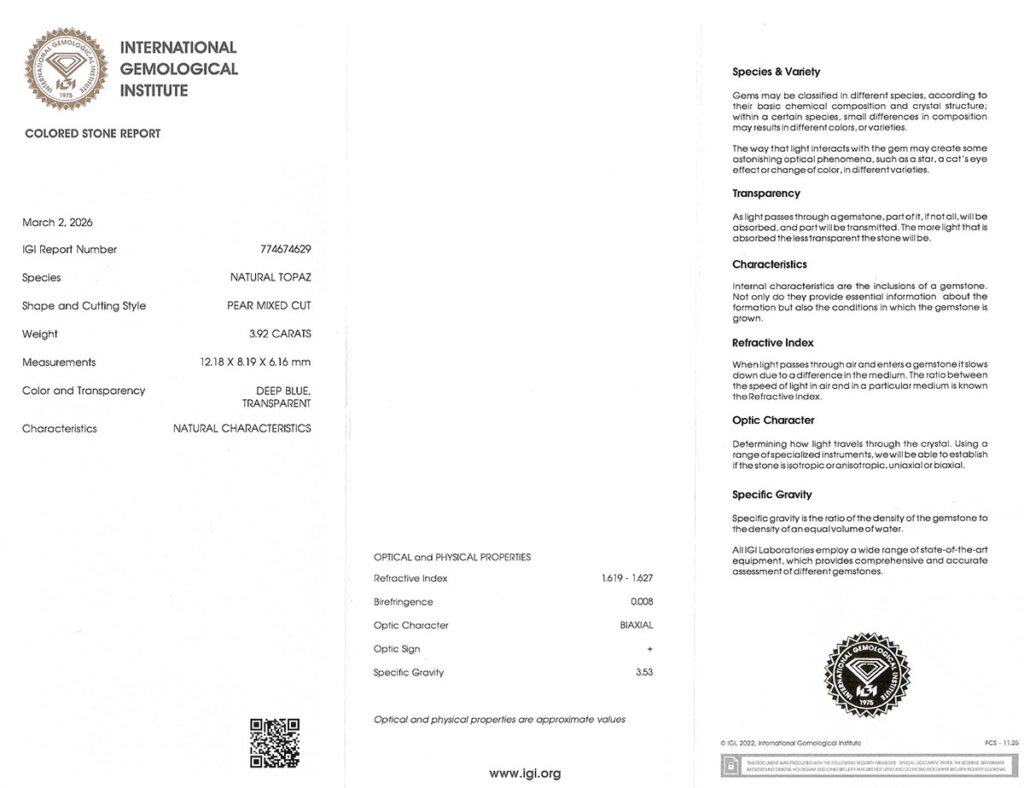 Kámen je včetně mezinárodně uznávaného certifikátu IGI a je zataven do ochranného pouzdra.
