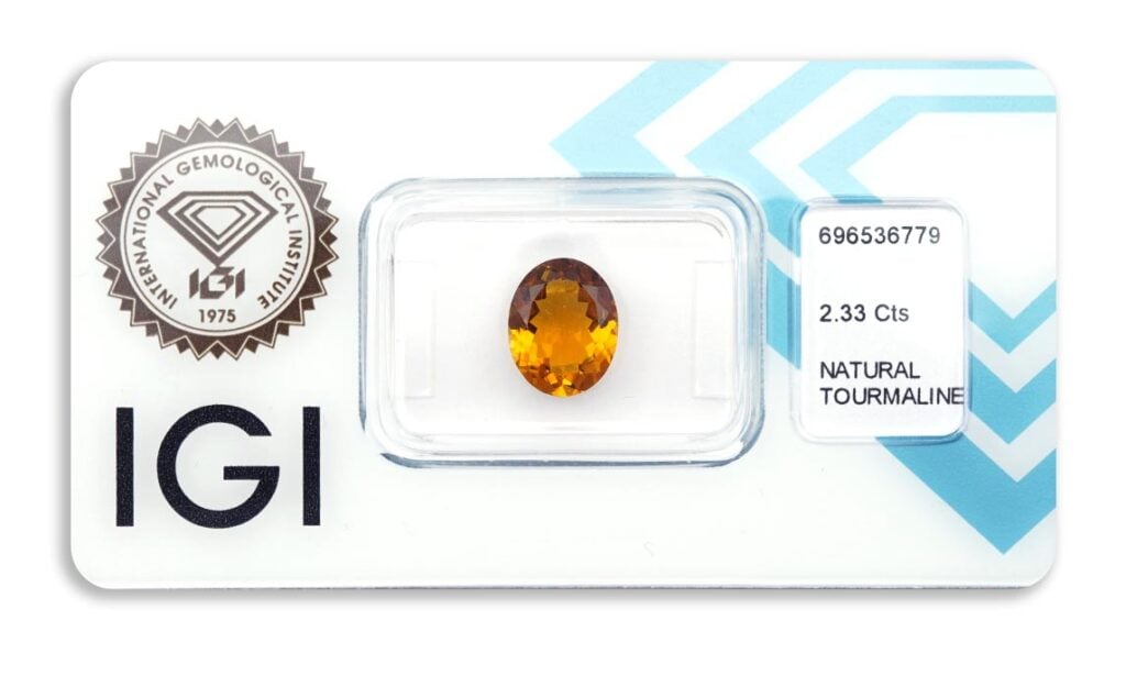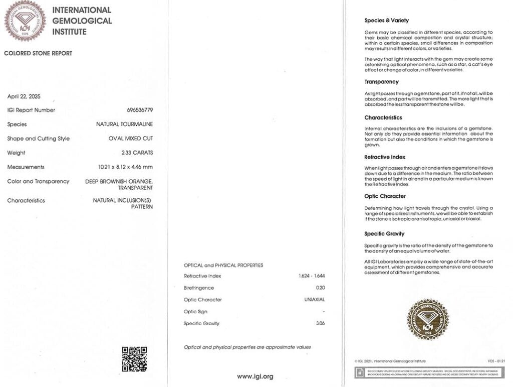 turmalín 2.33ct deep brownish orange s IGI certifikátem