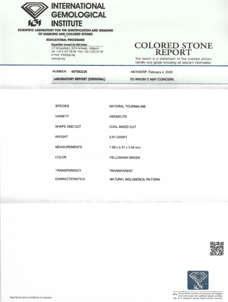 verdelit 0.81ct yellowish green s IGI certifikátem