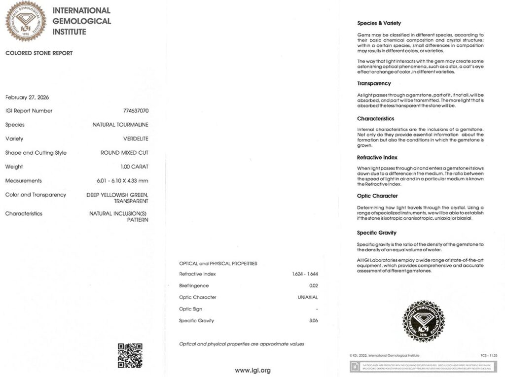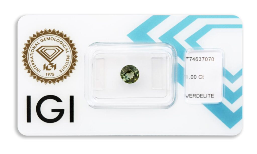verdelit 1.00ct deep yellowish green s IGI certifikátem