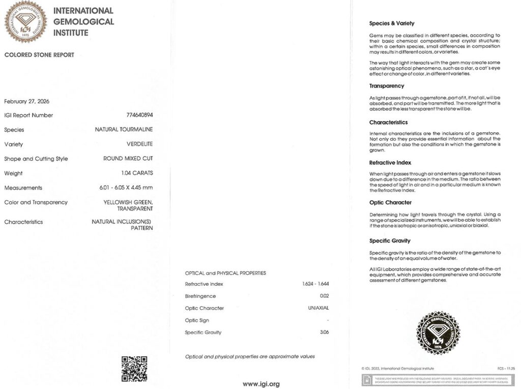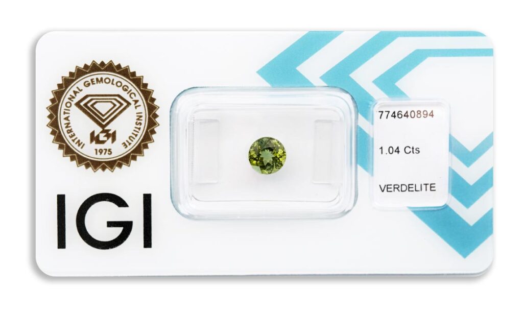 verdelit 1.04ct yellowish green s IGI certifikátem