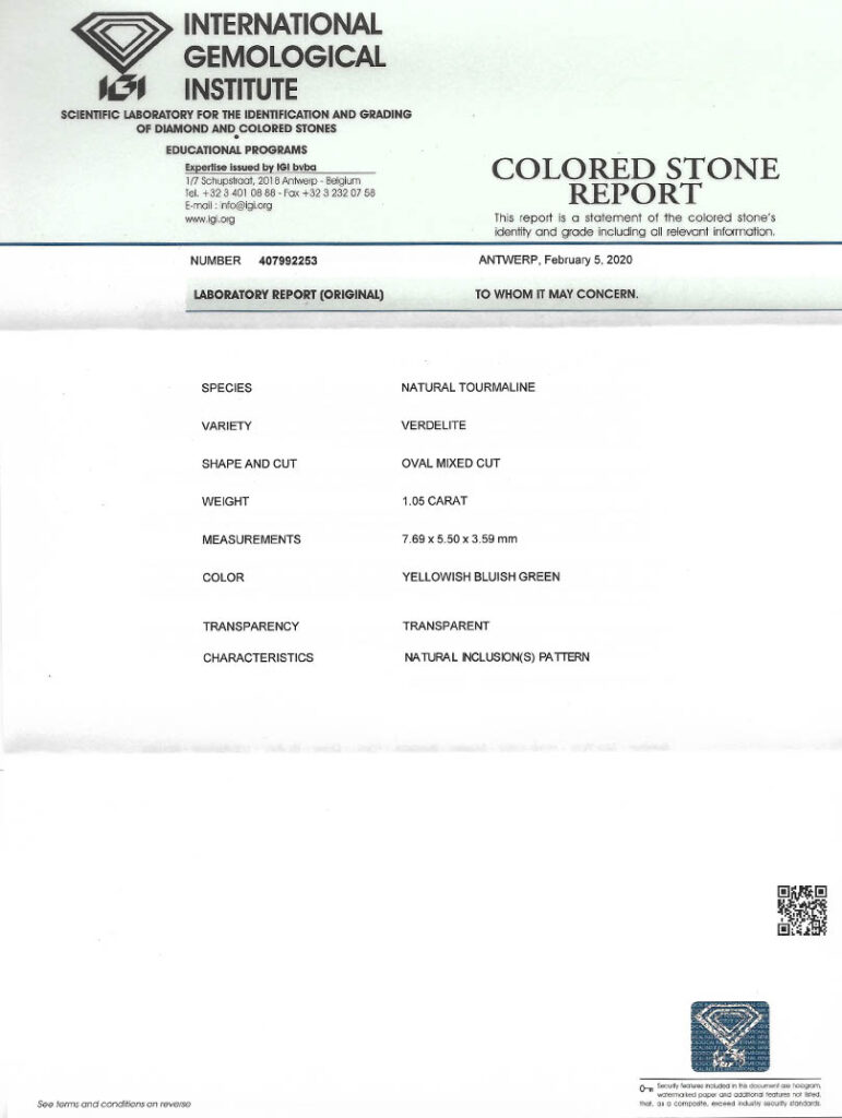 verdelit 1.05ct yellowish bluish green s IGI certifikátem