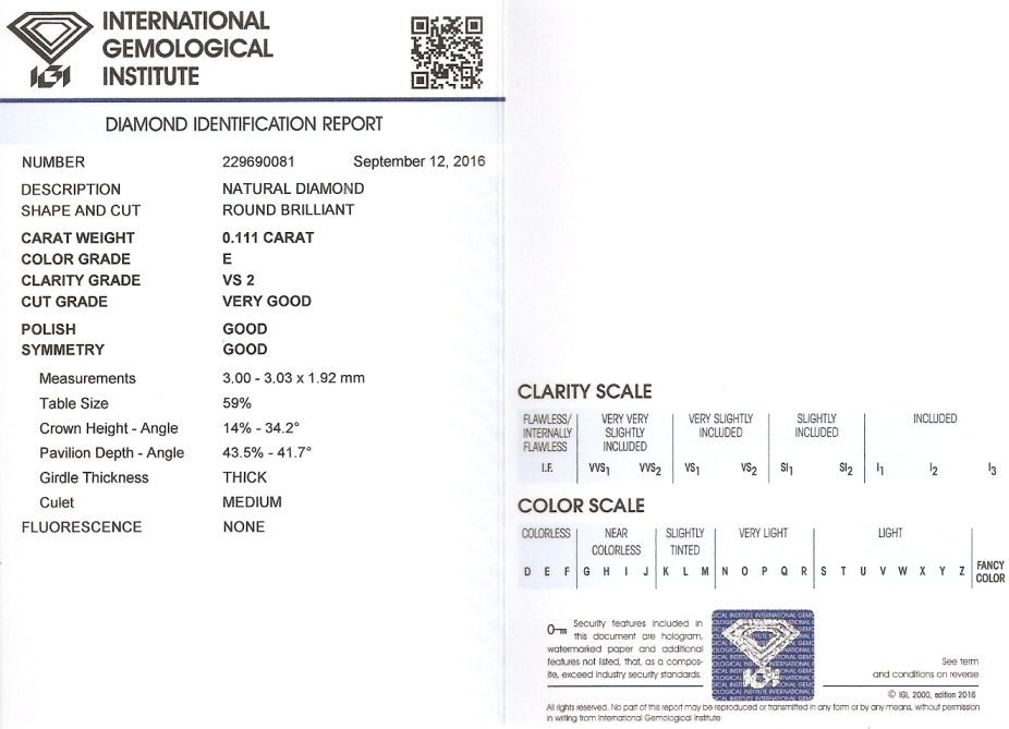 Diamant 0.111ct E/VS2 s IGI certifikátem