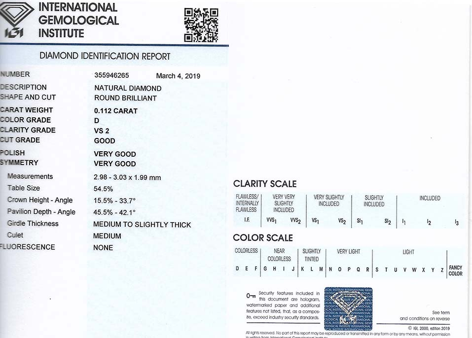 Diamant 0.112ct D/VS2 s IGI certifikátem