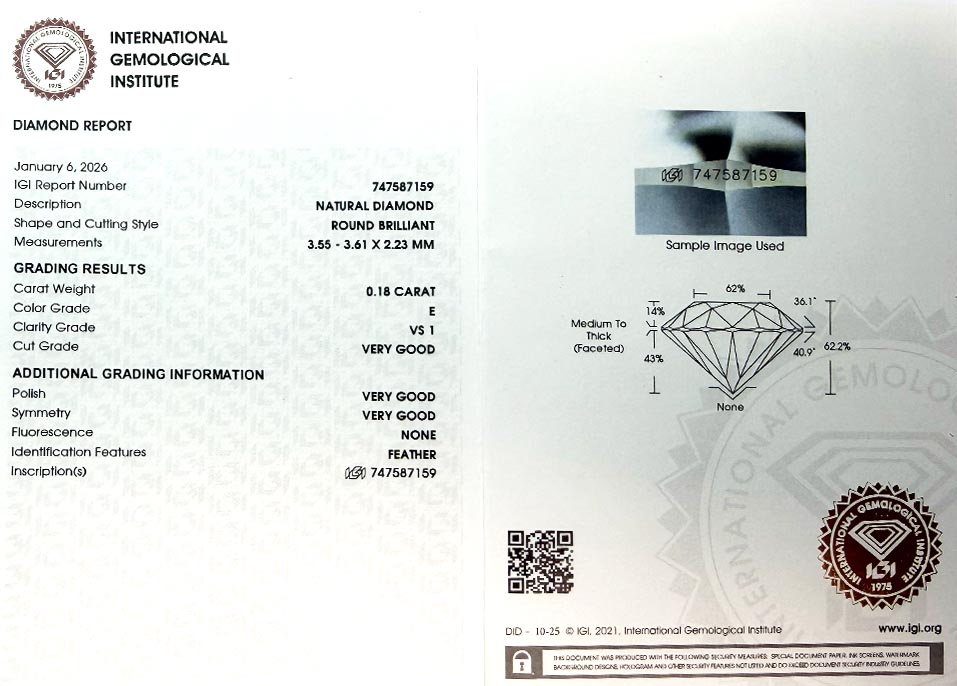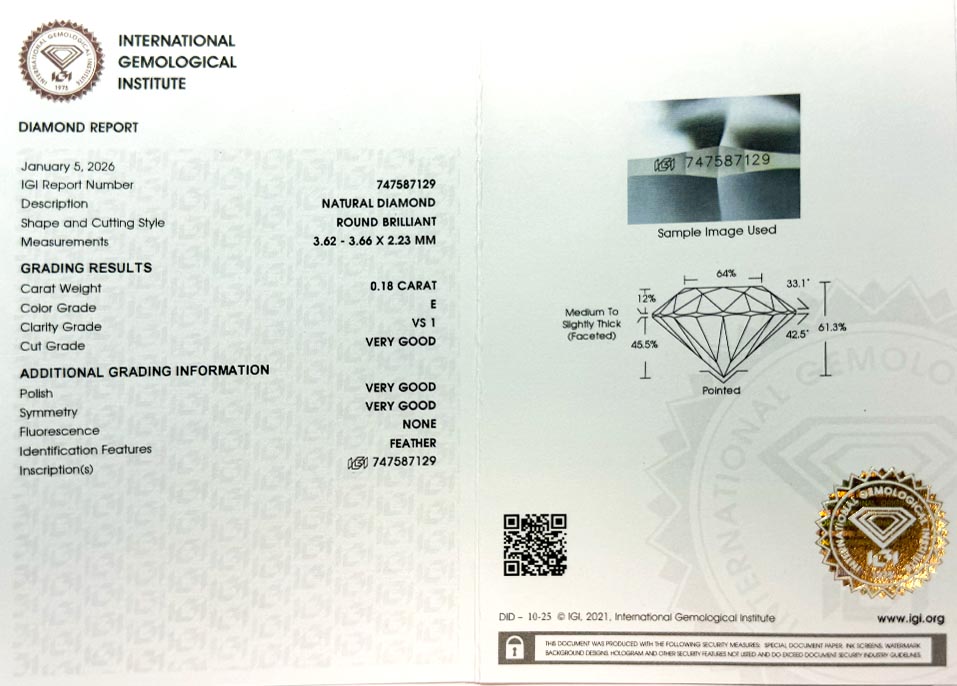 Diamant 0.18ct E/VS1 s IGI certifikátem