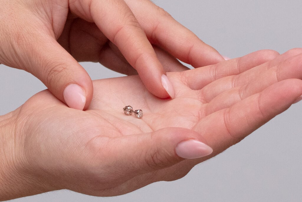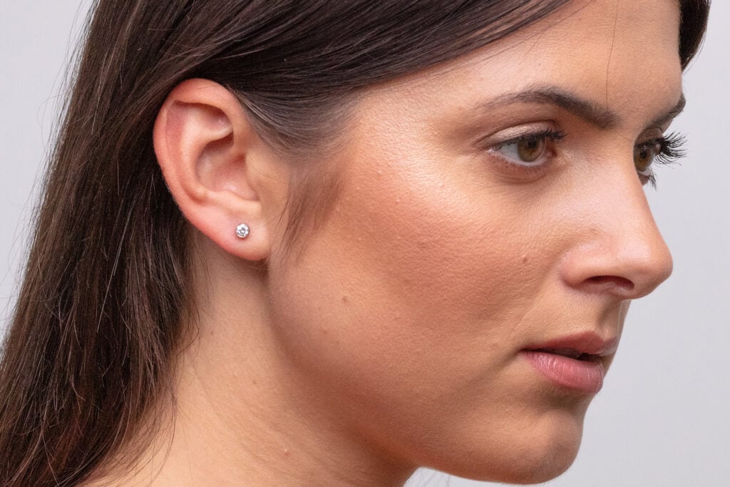 Decentní model diamantových náušnic se solitérním osazením lunetového typu, kdy zlatý plíšek lemuje nepatrnou část hrany briliantu po celém jeho obvodu. Narozdíl od standardních využití lunety kopíruje toto lůžko přesný tvar diamantu a tvoří tak jen velmi decentní okraj. U typů peckových náušnic využíváme obvykle zapínání na šroubek, který patří mezi nejbezpečnější formy zapínání. Pro snadnou manipulaci s náušnicemi a snazší napojení na závit trnu používáme výhradně matičky balónkového typu. Délka závitu je jednotné délky, avšak může být upravena dle Vašich individuálních potřeb.