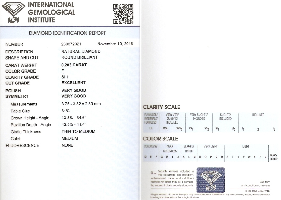 Diamant 0.203ct F/SI1 s IGI certifikátem