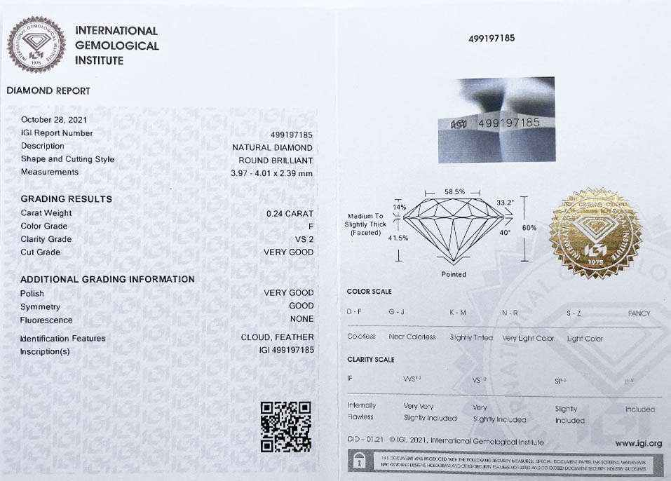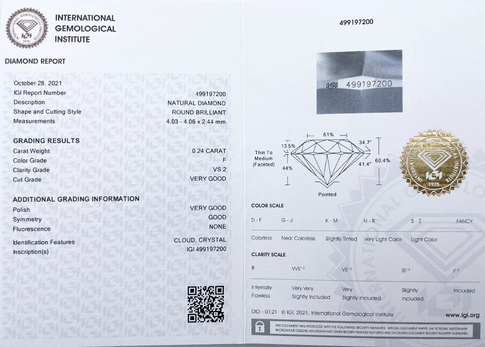 Diamant 0.24ct F/VS2 s IGI certifikátem