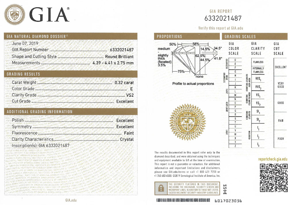 Náušnice jsou zhotoveny ve 14k bílém zlatě a jsou opatřeny mezinárodně uznávanými certifikáty GIA. Diamanty jsou laserově číslovány na své rundistě laboratoří GIA.