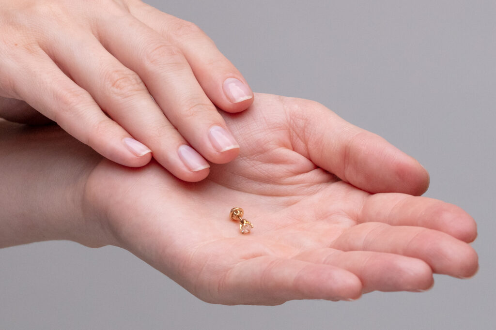 Velmi oblíbený model decentních diamantových náušnic se solitérním osazením do lůžka se šesti krapnami, které nádherně kopírují kulatý tvar briliantů všech velikostí, avšak dokonale a nerušeně nechají vyniknout jejich kráse. U typů peckových náušnic využíváme standardně zapínání na šroubek, jež patří mezi nejbezpečnější formy zapínání. Pro snadnou manipulaci s náušnicemi a snazší napojení na závit trnu používáme výhradně matičky balónkového typu. Délku závitu je univerzální, avšak v konkrétních případech může být přizpůsobena Vašim individuálním potřebám.