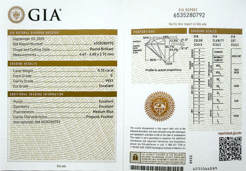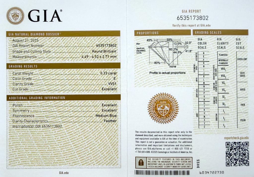 byl založen v roce 1931 a patří k absolutní špičce mezi gemologickými laboratořemi po celém světě a dodržuje pravidla stanovená Diamond High Council v plném rozsahu. Všechny diamanty na stránkách VVDiamonds opatřeny certifikátem GIA, lze verifikovat na stránkách GIA. Většina diamantů je laserově číslována pro větší bezpečnost obchodu.