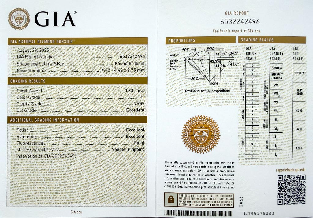 byl založen v roce 1931 a patří k absolutní špičce mezi gemologickými laboratořemi po celém světě a dodržuje pravidla stanovená Diamond High Council v plném rozsahu. Všechny diamanty na stránkách VVDiamonds opatřeny certifikátem GIA, lze verifikovat na stránkách GIA. Většina diamantů je laserově číslována pro větší bezpečnost obchodu.