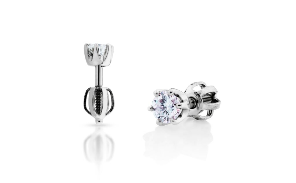 Velmi oblíbený model decentních diamantových náušnic se solitérním osazením do lůžka se šesti krapnami, které nádherně kopírují kulatý tvar briliantů všech velikostí, avšak dokonale a nerušeně nechají vyniknout jejich kráse. U typů peckových náušnic využíváme standardně zapínání na šroubek, jež patří mezi nejbezpečnější formy zapínání. Pro snadnou manipulaci s náušnicemi a snazší napojení na závit trnu používáme výhradně matičky balónkového typu. Délku závitu je univerzální, avšak v konkrétních případech může být přizpůsobena Vašim individuálním potřebám.