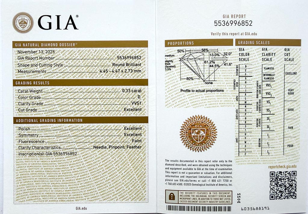 Pro snazší ověření pravosti diamantů byla jejich hrana označena mikroskopickou laserovou inskripcí laboratoře GIA.