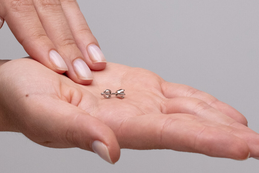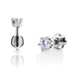 Velmi oblíbený model decentních diamantových náušnic se solitérním osazením do lůžka se šesti krapnami, které nádherně kopírují kulatý tvar briliantů všech velikostí, avšak dokonale a nerušeně nechají vyniknout jejich kráse. U typů peckových náušnic využíváme standardně zapínání na šroubek, jež patří mezi nejbezpečnější formy zapínání. Pro snadnou manipulaci s náušnicemi a snazší napojení na závit trnu používáme výhradně matičky balónkového typu. Délku závitu je univerzální, avšak v konkrétních případech může být přizpůsobena Vašim individuálním potřebám.