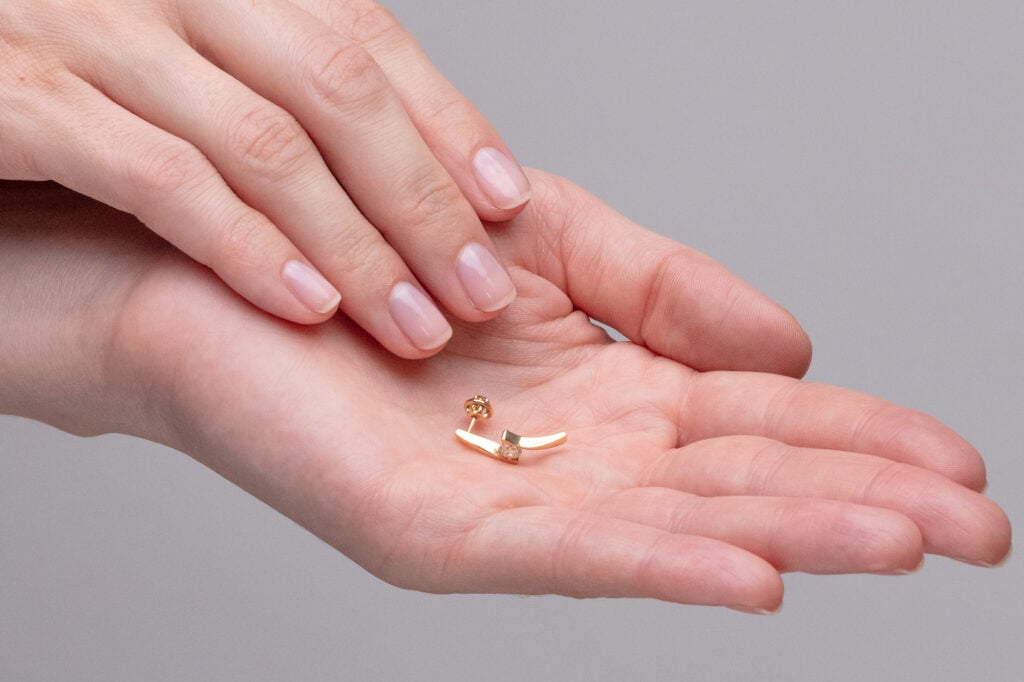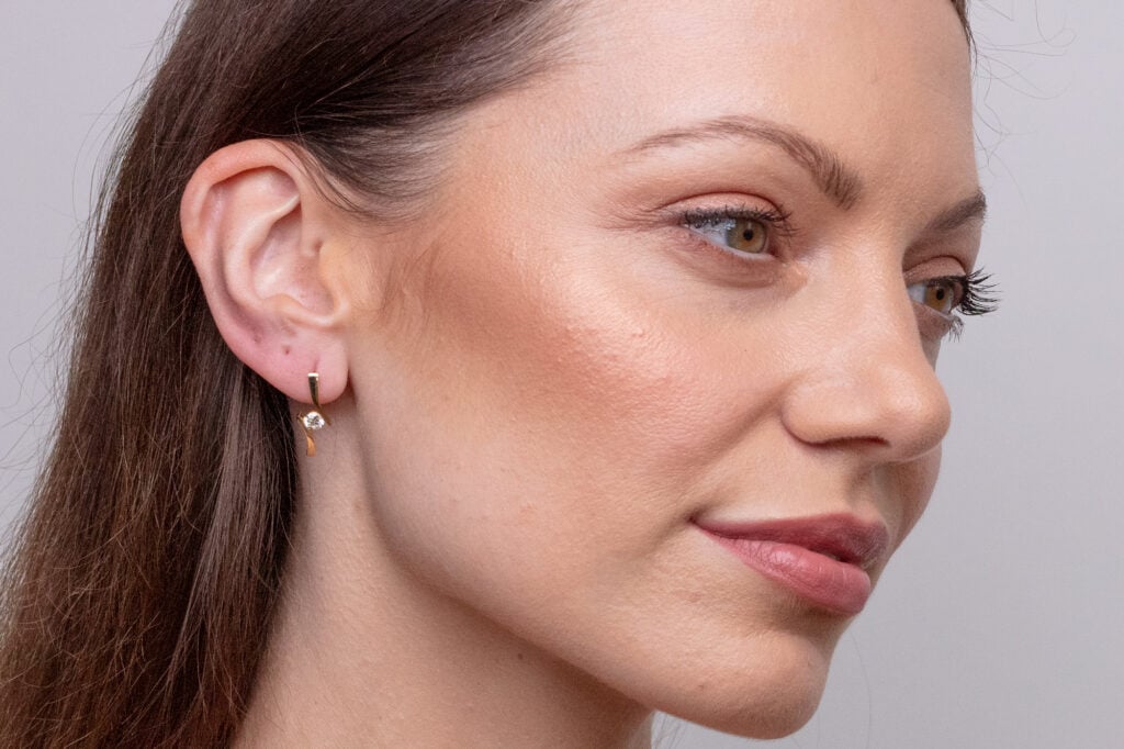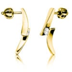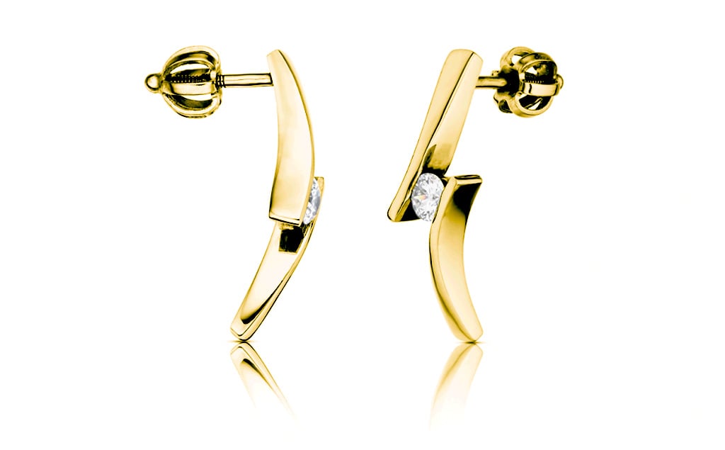 Netradiční typ visacích náušnic zpracovaných do jednoduchého, ale zato elegantního designu, u něhož jsou centrální mezinárodně certifikované diamanty v jemném sevření dvou výrazných zlatých plíšků vychýlených ze své osy. Vzhledem k tomu, že nejsou využity další krapny k uchycení diamantu, působí celý šperk velmi čistým dojmem. Zapínání je v tomto případě vyřešeno trnem, na jehož dostatečně dlouhém závitu je praktický zlatý balónek zabraňující nechtěné ztrátě šperku. Délka závitu je univerzální, ale může být upravena dle Vašich individuálních potřeb.