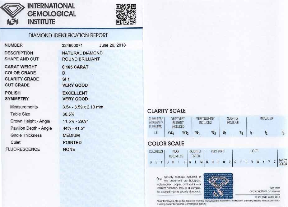 Diamant 0.165ct D/SI1 s IGI certifikátem