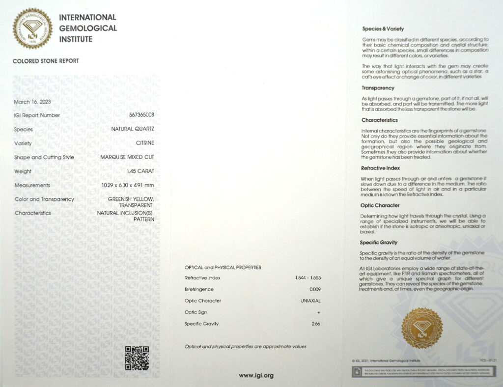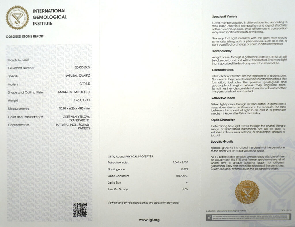 citrín 1.46ct greenish yellow s IGI certifikátem
