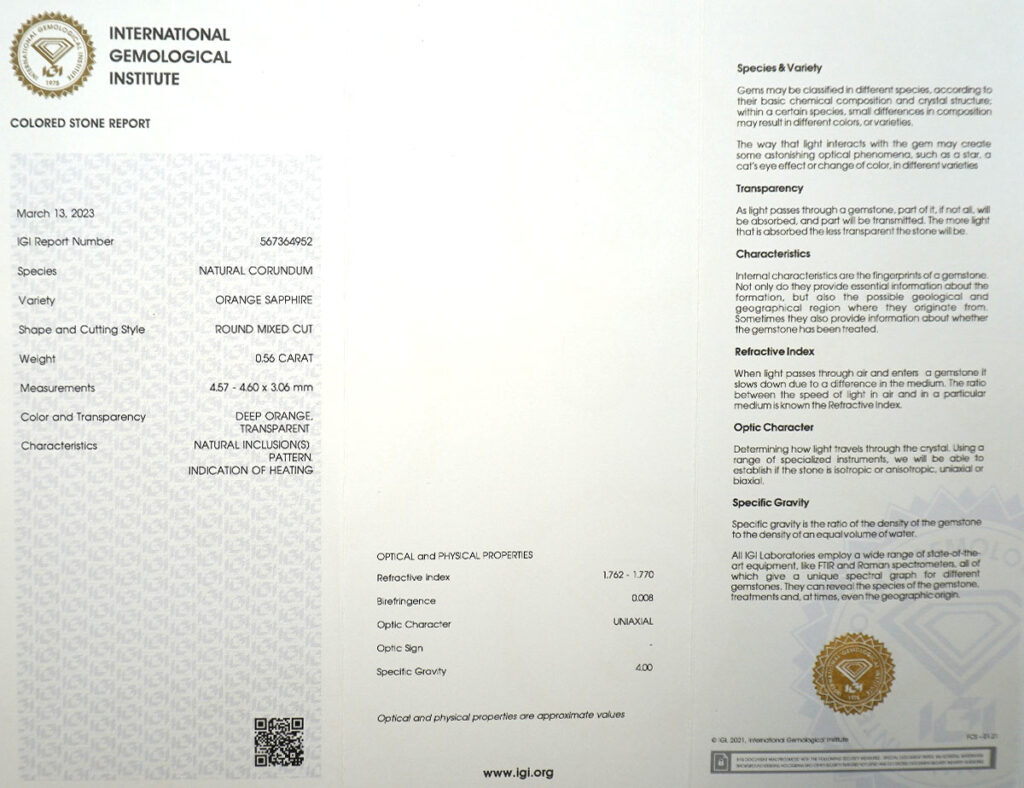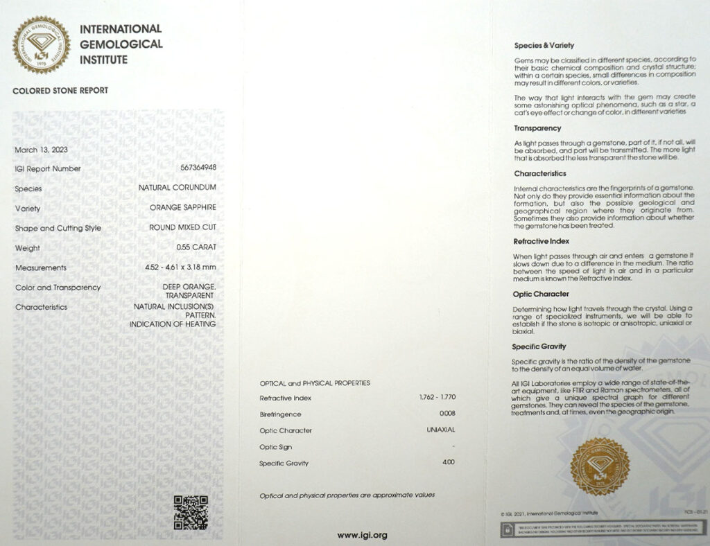 zlaté náušnice s oranžovými safíry 1.11ct s IGI certifikáty