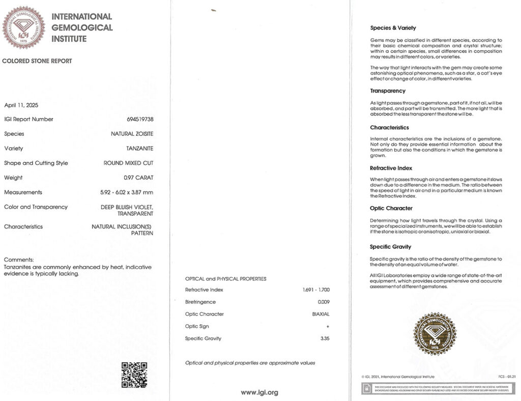 Visací tanzanitové náušnice ručně vyrobené v pražském ateliéru ze 14k bílého zlata vynikají precizní klenotnickou prací a smyslem pro detail. Dominantou šperku jsou přírodní tanzanity o celkové hmotnosti 1.91ct, jejichž pravost a kvalitu potvrzují mezinárodně uznávané certifikáty gemologické laboratoře IGI.