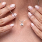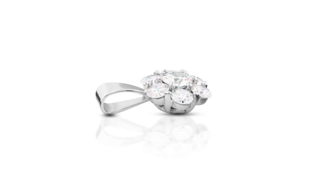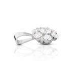 Dokonalý model diamantového přívěsku, jehož design nápadně připomíná ledový květ. Centrální diamant briliantového brusu je doplněn celkem šesti „okvětními lístky“ v podobě přírodních diamantů kulatého briliantového brusu, precizně osazených do jemných lůžek s drobnými krapnami. Osazenou část šperku opticky vyzdvihuje jednoduchý zlatý závěs, jenž se směrem k diamantům záměrně zužuje.