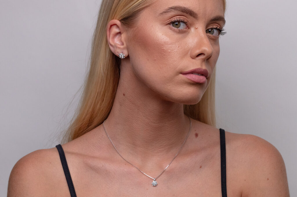 Šperk byl ručně vyroben ze 14k bílého zlata v pražském ateliéru a je dále osazen 6 ks kalibrovaných přírodních diamantů kvality F-G/VVS-VS o celkové hmotnosti 0.34ct. Centrální diamant je opatřený mezinárodně uznávaným certifikátem gemologické laboratoře IGI.