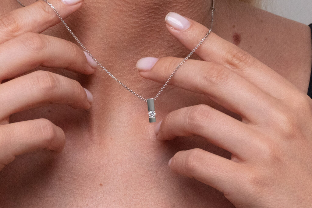 Šperk byl ručně vyroben ze 14k bílého zlata v pražském ateliéru a je osazen přírodním diamantem opatřeným mezinárodně uznávaným certifikátem gemologické laboratoře IGI.