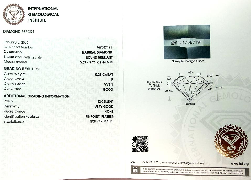 Šperk byl ručně vyroben ze 14k bílého zlata v pražském ateliéru a je osazen přírodním diamantem opatřeným mezinárodně uznávaným certifikátem gemologické laboratoře IGI.