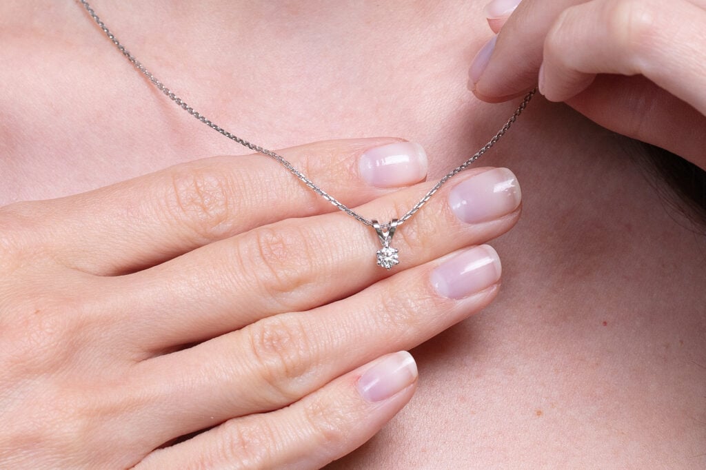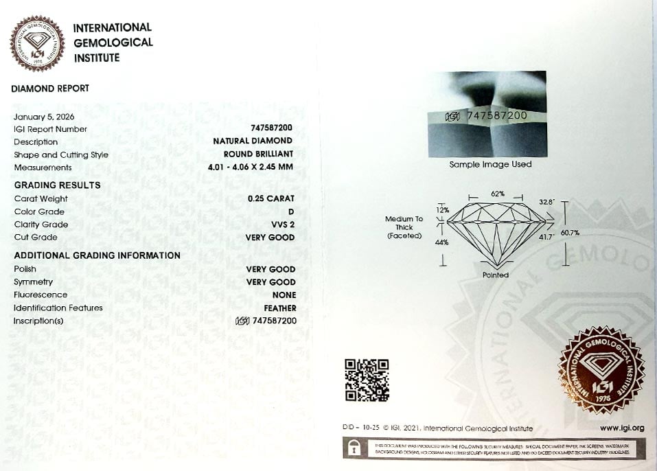 Šperk byl ručně vyroben ze 14k bílého zlata v pražském ateliéru a je osazen přírodním diamantem opatřeným mezinárodně uznávaným certifikátem gemologické laboratoře IGI.