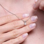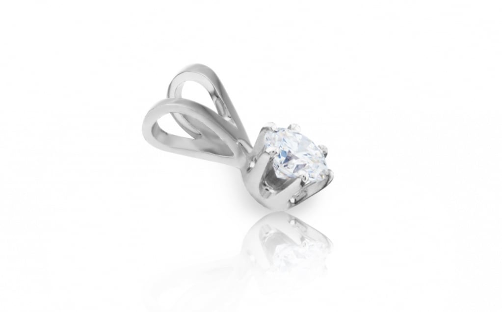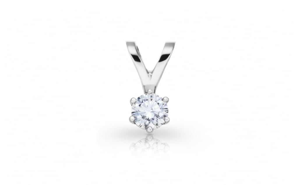 Výrazný model zlatého diamantového přívěsku s elegantně řešeným závěsem ve tvaru písmene „V“ a bezpečným stylem osazení drahokamu sestaveného z šesti jemných krapen. Díky jednoduché myšlence a rozdělení závěsného očka do dvou ramen je tento design zcela odlišný od běžně dostupných přívěsků, které pro zavěšení využívají tradiční metodu v podobě uceleného očka. Zároveň však lze dokonale kombinovat s ostatními šperky se stejným typem korunky.