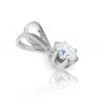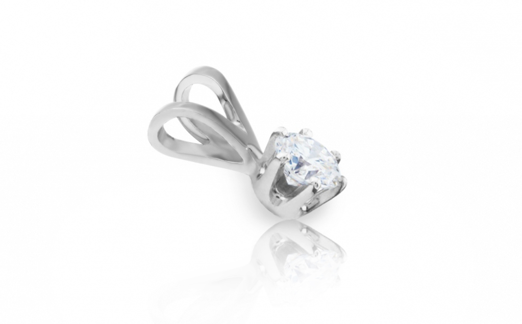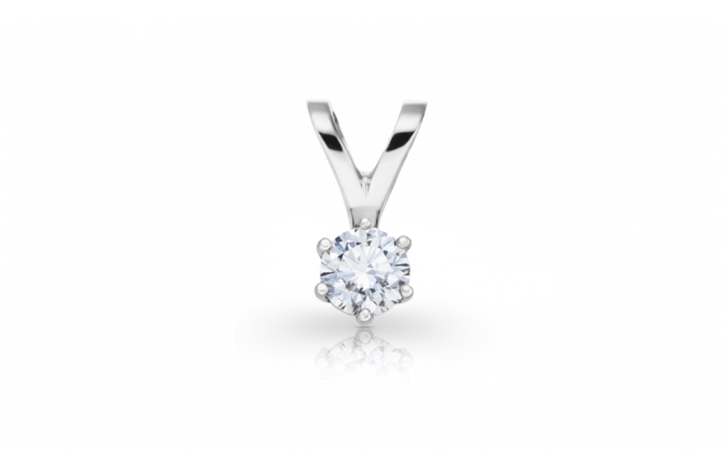 Výrazný model zlatého diamantového přívěsku s elegantně řešeným závěsem ve tvaru písmene „V“ a bezpečným stylem osazení drahokamu sestaveného z šesti jemných krapen. Díky jednoduché myšlence a rozdělení závěsného očka do dvou ramen je tento design zcela odlišný od běžně dostupných přívěsků, které pro zavěšení využívají tradiční metodu v podobě uceleného očka. Zároveň však lze dokonale kombinovat s ostatními šperky se stejným typem korunky.
