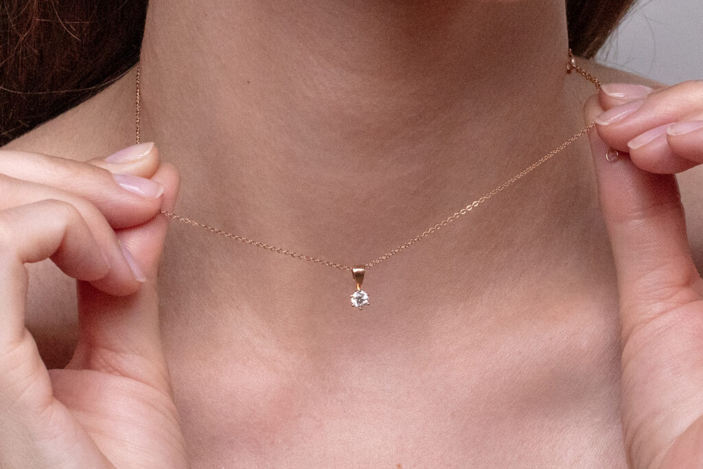 Šperk byl ručně vyroben ze 14k růžového zlata v pražském ateliéru a je osazen přírodním diamantem opatřeným mezinárodně uznávaným certifikátem gemologické laboratoře GIA.