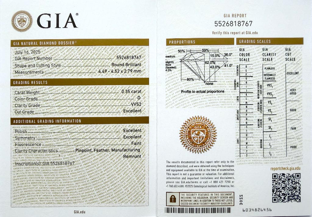byl založen v roce 1931 a patří k absolutní špičce mezi gemologickými laboratořemi po celém světě a dodržuje pravidla stanovená Diamond High Council v plném rozsahu. Všechny diamanty na stránkách VVDiamonds opatřeny certifikátem GIA, lze verifikovat na stránkách GIA. Většina diamantů je laserově číslována pro větší bezpečnost obchodu.