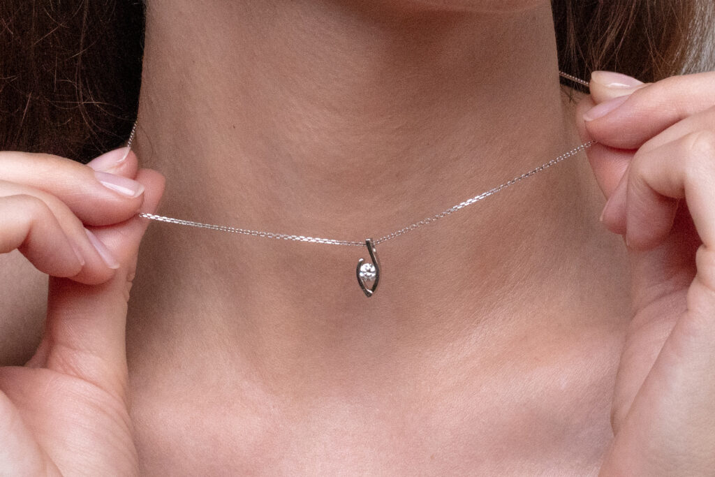 Velmi atypický model diamantového přívěsku sestavený pouze z jednoho kusu zlatého plíšku s jemně oblými hranami. Ten díky důmyslnému tvaru drží diamant kulatého briliantového brusu přímo ve své centrální části. Šperk je zároveň sestaven tak, aby velmi efektivním způsobem svíral protilehlé hrany drahokamu, čímž zabraňuje jeho nechtěnému uvolnění.