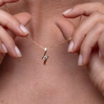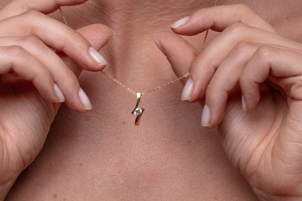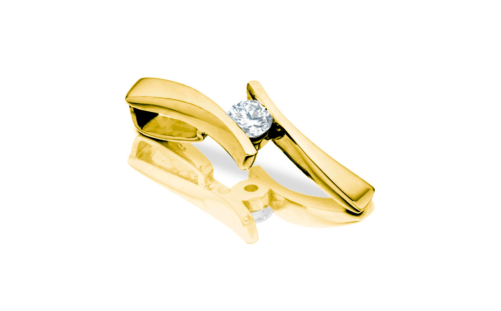 Oblíbený model diamantového přívěsku, jehož konstrukce je sestavena tak, aby měl pozorující pocit, že spoj mezi dvěma zlatými protilehlými rameny tvoří pouze centrální diamant kulatého briliantového brusu. Ve skutečnosti je pevný spoj vytvořen v samotné středové části přímo za drahokamem a zaručuje tak jeho bezpečné, avšak velmi elegantní osazení ve šperku.