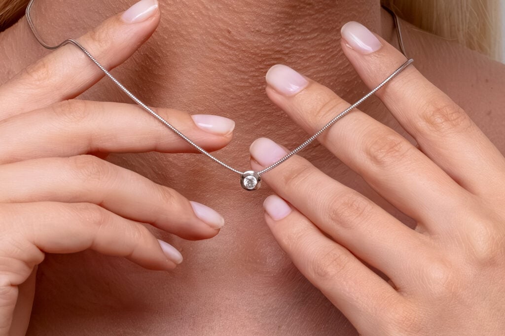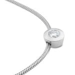Model zlatého diamantového přívěsku s tradiční tzv. lunetovou formou osazení, jež obecně patří mezi nejbezpečnější formy uchycení drahokamů. Zlatý plíšek pevně svírá malou část hrany diamantu briliantového brusu po celém jeho obvodu, a tím velmi efektivní formou zamezuje jeho nechtěnému uvolnění. Další výhodou lunetového osazení je širší a dokonale lesklá hrana, která diamantový šperk zvětší. Díky skrytému závěsu je samotný přívěsek součástí zlatého řetízku typu „hádek“, jenž svým designem dodává této kombinaci nádhernou eleganci.
