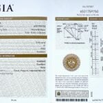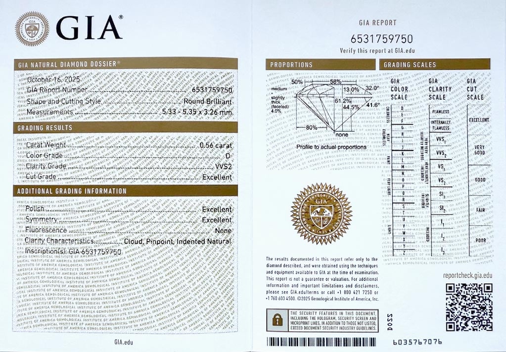 Uprostřed šperku září centrální půlkarátový diamant vysoce nadstandardních hodnot D/VVS2, certifikovaný mezinárodní gemologickou laboratoří GIA. Pro snazší ověření pravosti diamantu označila laboratoř GIA jeho hranu vlastní mikroskopickou laserovou inskripcí.