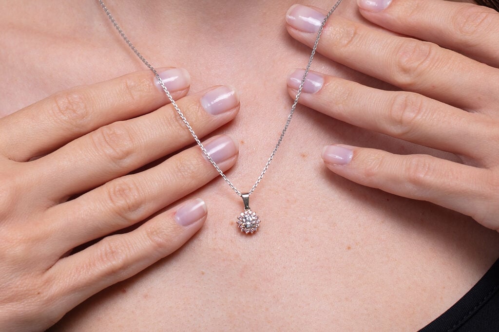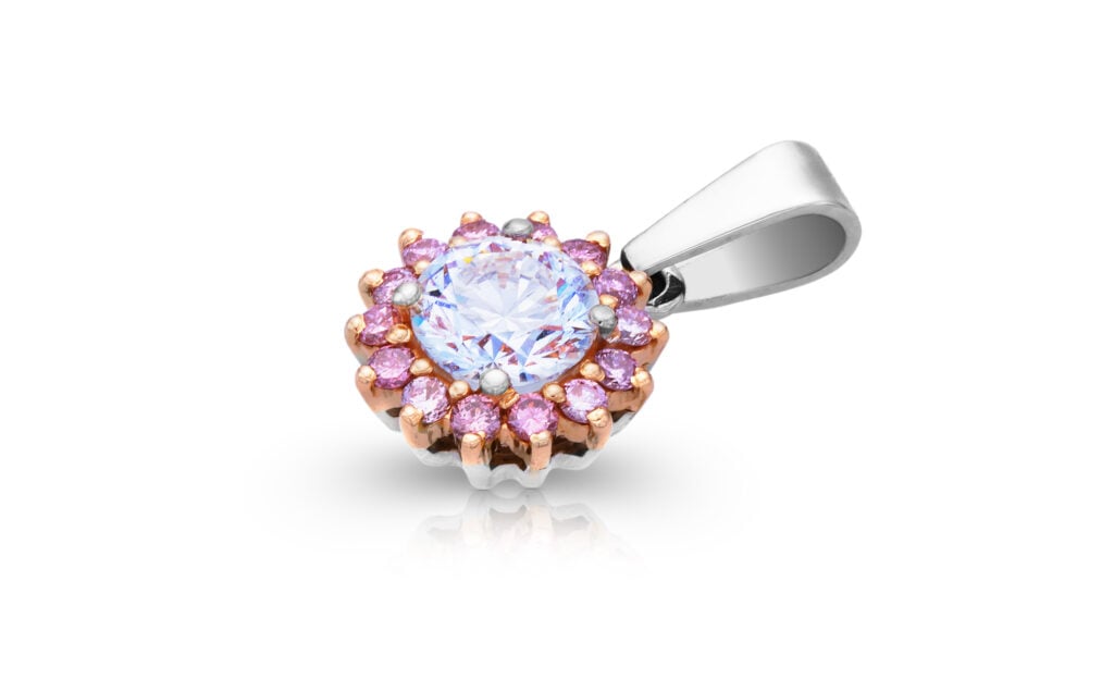 Tento elegantní přívěsek spojuje lesk 14k bílého a růžového zlata s výjimečnou krásou 14 přírodních růžových diamantů z dolu Argyle o celkové hmotnosti 0.14ct, precizně osazených do tvaru květu, jenž symbolizuje ženskost a jedinečnost.