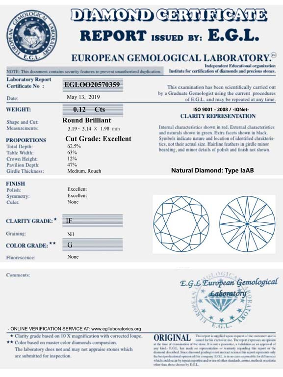 IF (Internally Flawless): Diamant neobsahuje žádné vnitřní inkluze a je nejvyšším stupněm čistoty. Pro ověření čistoty je nutné použití binokulárního mikroskopu profesionálním hodnotitelem. Jedná se o ryze investiční čistotu diamantu.