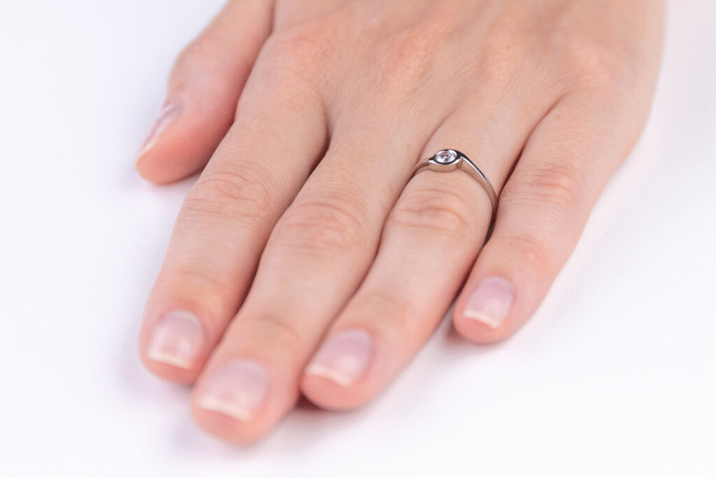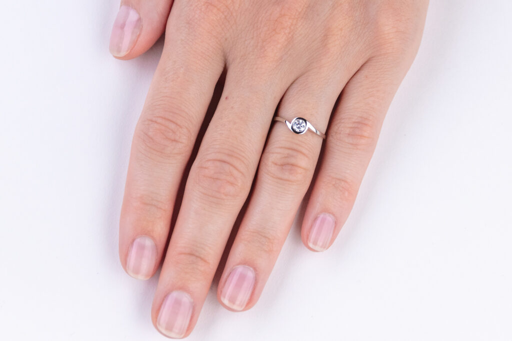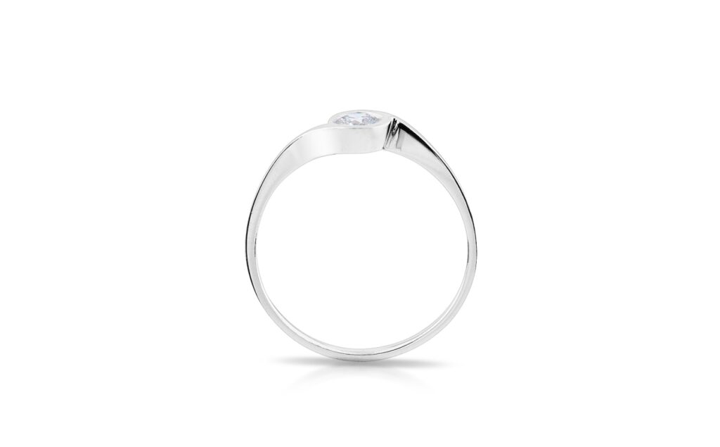 Oblíbený model diamantového prstenu, který je vhodný pro různé hmotnostní kategorie briliantových brusů. Obroučka zaujme svým asymetrickým tvarem, jenž ve středu šperku plynule přechází do jednoduché korunky s lunetovým osazením diamantu. V tomto případě uchycení je hrana drahokamu po celém svém obvodu zakryta tenkou částí zlatého plíšku, pevně držícím diamant ve své pozici.