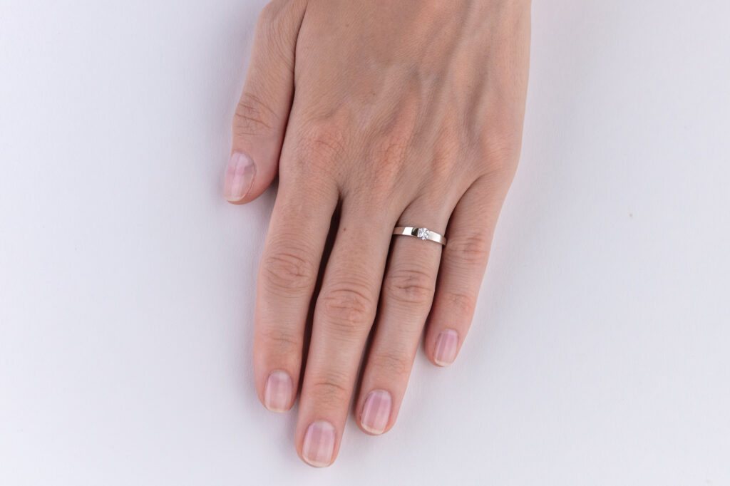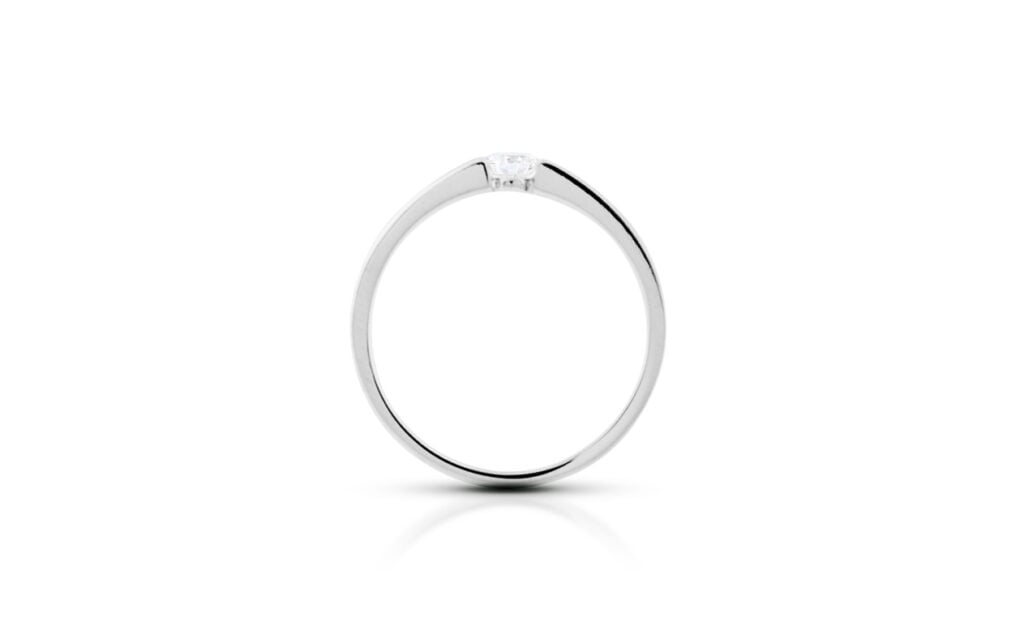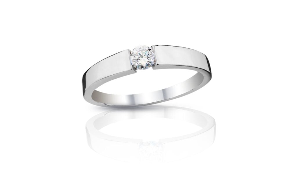Elegantní diamantový prsten jednoduchého, avšak velmi poutavého designu, u kterého je centrální diamant usazen přímo do výřezu obroučky. Pohledová strana prstenu je záměrně navržena tak, aby měl pozorovatel pocit, že je drahý kámen svírán samotnou obroučkou šperku pouze ze dvou stran, ve skutečnosti se pod diamantem nachází pevný spoj, zaručující jeho bezpečné a pohodlné nošení.